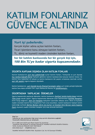 5411 sayılı Bankacılık Kanunu ile tüm bankalardaki tasarruf mevduatlarının belli bir kısmı TMSF güvencesi altına alınmıştır. Katılım bankaları da bankacılık sistemine dahil olduğu için aynı şartlar burada da geçerlidir. Mevduat ve katılım fonu toplamaya yetkili mevduat ve katılım bankalarının (kredi kuruluşlarının) Bankacılık Düzenleme ve Denetleme Kurumu (BDDK) tarafından faaliyet izinlerinin kaldırılması durumunda, mevduat ve katılım fonu hak sahiplerinin mâruz kalacağı kayıpların devlet veya bu amaçla kurulmuş özel bir kurum tarafından kısmen ya da tamamen ödenmesinin garanti edilmesine tasarruf mevduatı ve katılım fonu sigortası denilir. Türkiyede mevduatın ve katılım fonlarının sigortalanması yetki ve görevi kamu tüzel kişiliğini haiz Tasarruf Mevduatı Sigorta Fonu